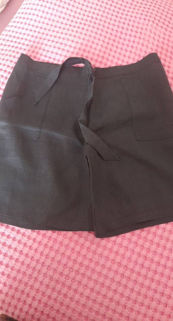 Düğmeli ve cepli, rahat kesim siyah keten kadın bermuda şort. Kısa boyda ve desensiz, günlük kullanıma uygun.