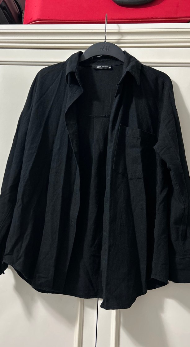 Siyah keten kumaştan, düğmeli, uzun kollu, notched yaka ve bol kesimli kadın gömlek. Günlük kullanıma uygun midi uzunlukta.