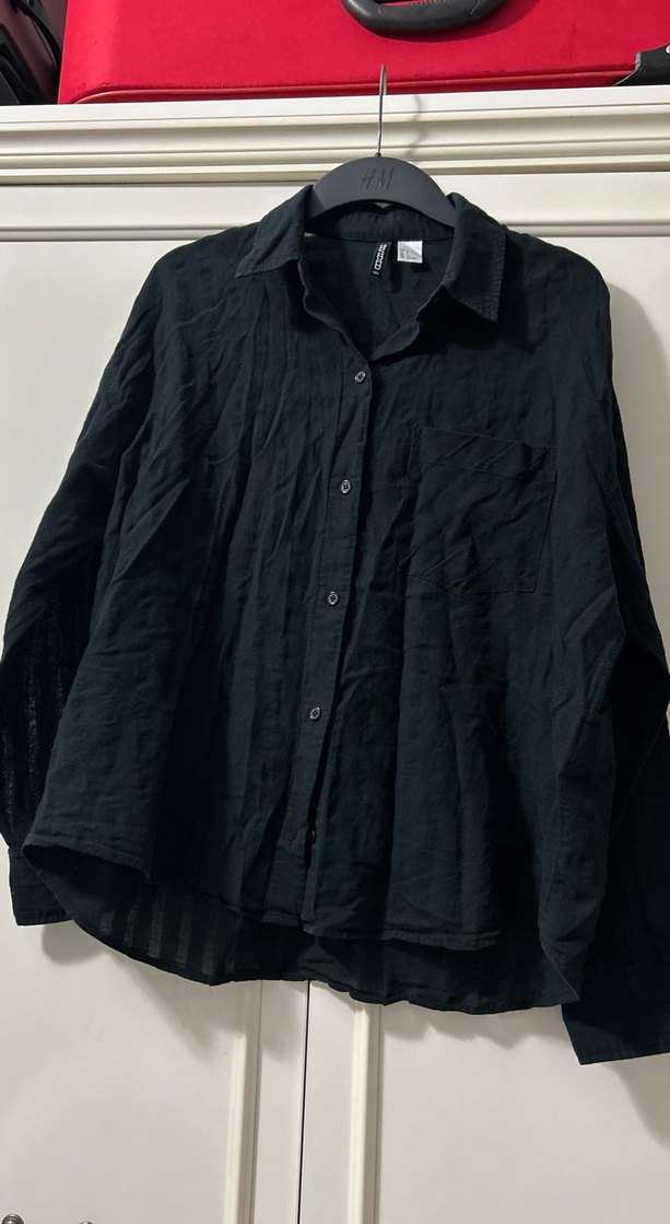 Uzun kollu, düğmeli, keten kumaştan siyah kadın gömleği. Normal boyda, notched lapel yakalı, bol kesim rahat kullanıma uygun.