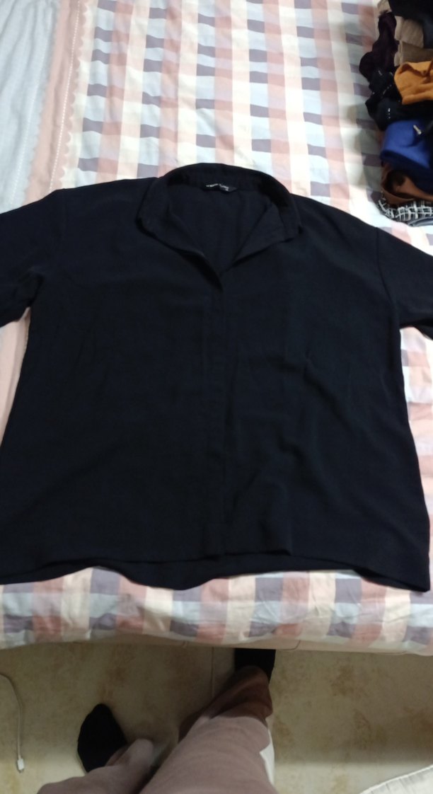 Siyah keten kumaştan, kısa kollu, yakalı ve düğmeli kadın gömleği. Bol kesim ve normal boy uzunluğundadır, günlük rahat sokak stiline uygundur.