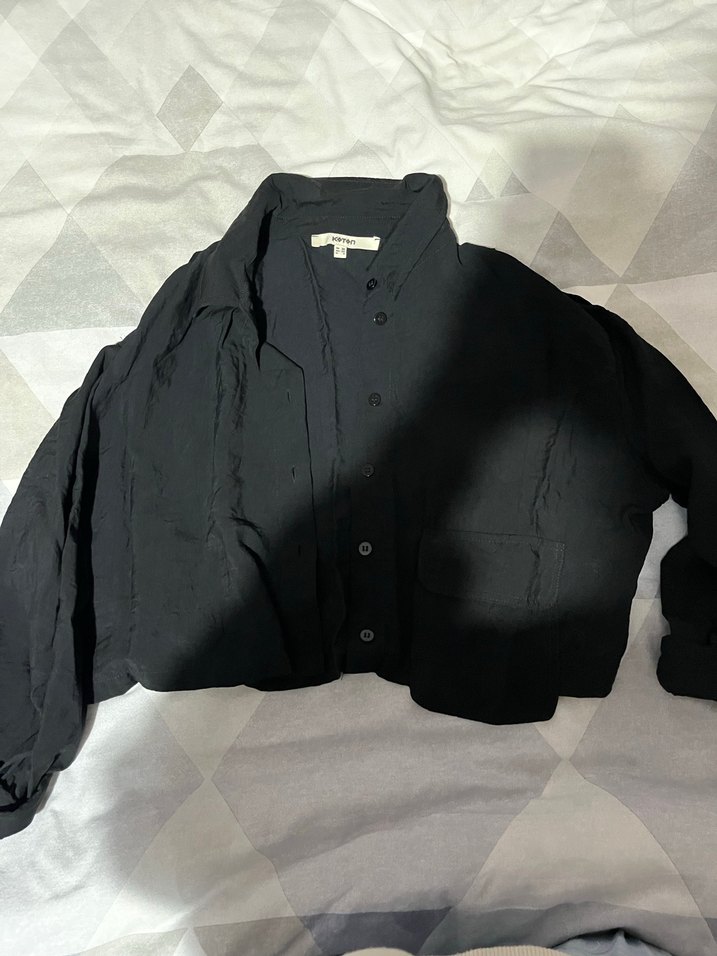 Siyah keten kadın gömlek, düğmeli ve yakalıdır. Uzun kollu ve bol kesimdir. Minimalist ve sade tarzda, günlük kullanıma uygundur.
