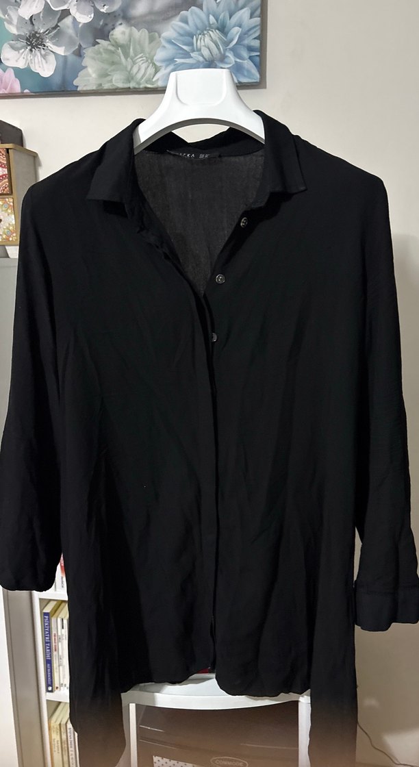 Siyah keten kadın gömlek, düğmeli ön, yakalı, uzun kollu ve midi boyda. Ofis kullanımı için uygun, bol kesim gömlek.