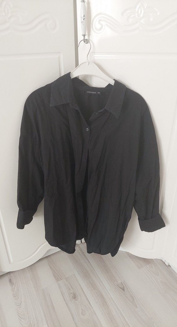 Siyah keten kumaştan yapılmış, salaş kesim ve uzun kollu kadın gömleği. Minimalist, desensiz ve yakalı tasarımıyla ofis için uygun rahat bir şıklık sunar. buyuk beden