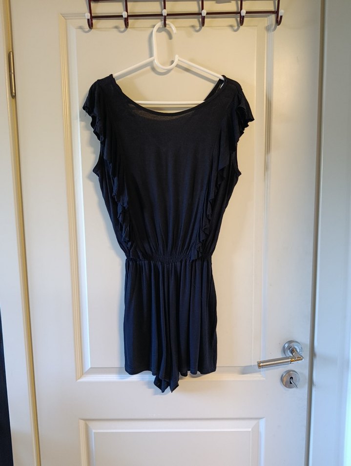 Siyah keten kumaştan, salaş kesim, kolsuz ve fırfır detaylı kısa tulum, günlük kullanım için uygundur. bir defa kullanım beden m