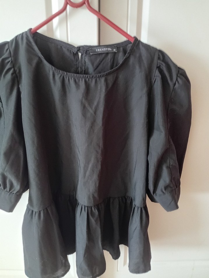 Siyah keten kumaştan, kısa kollu, yuvarlak yakalı, bol kesim midi bluz. Etek ve kollarında volan detayları bulunur, günlük şıklık için uygundur.