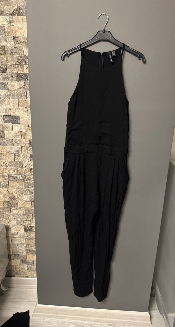 Kolsuz, yüksek yakalı siyah keten tulum. Salaş kesim ve drapeli detaylarla minimalist, avangart tarz sunar. Günlük kullanıma uygun. ✨