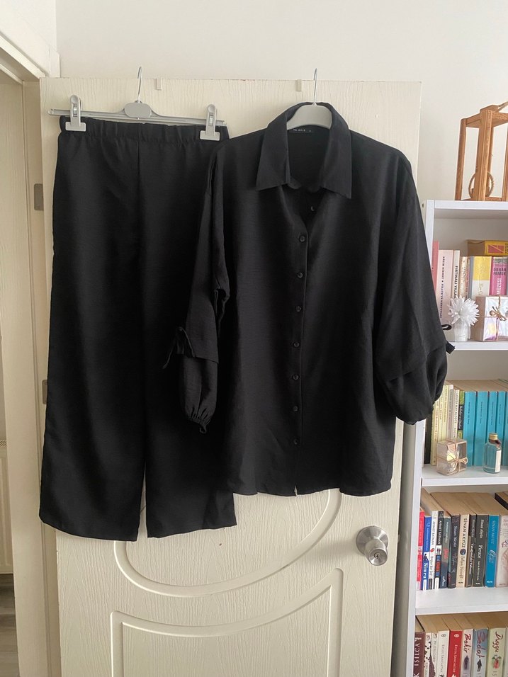Siyah keten kumaştan, düğmeli, uzun kollu ve kesimli yaka detaylı, midi boy, bol kesim kadın ofis takımı.