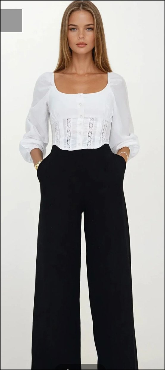 siyah keten pamuklu kumaştan, beli lastikli regular palazzo müslin kadın pantolon. Ofis için uygun, Paris sokak modası tarzında.