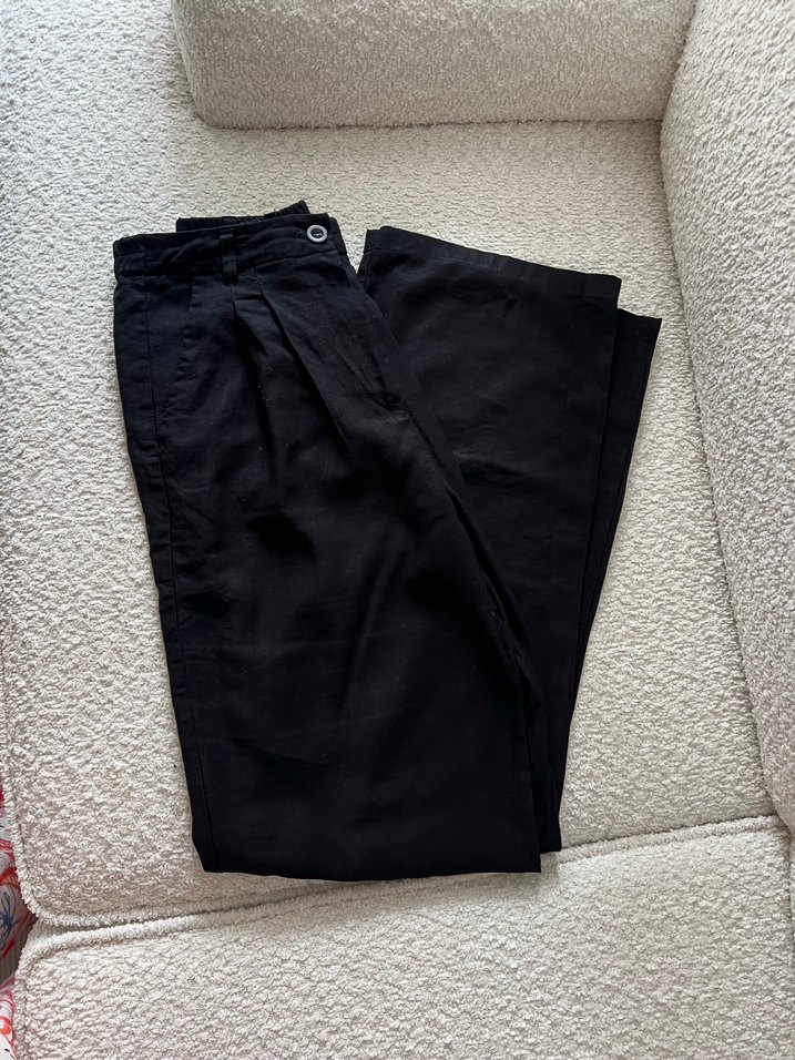 Siyah keten kumaştan, bol kesim kadın pantolon. Minimalist ve zahmetsiz şıklık sunar, günlük kullanıma uygundur.