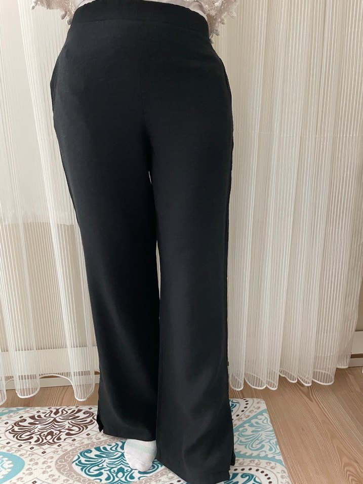 Henza markalı,bol kesim siyah keten kadın pantolon. Hasarsız ve temiz yıkandıktan sonra ütülemedim o yüzden kırışık üzerinden bir ütü geçilirse rahatlıkla açılır kırışıklıklar