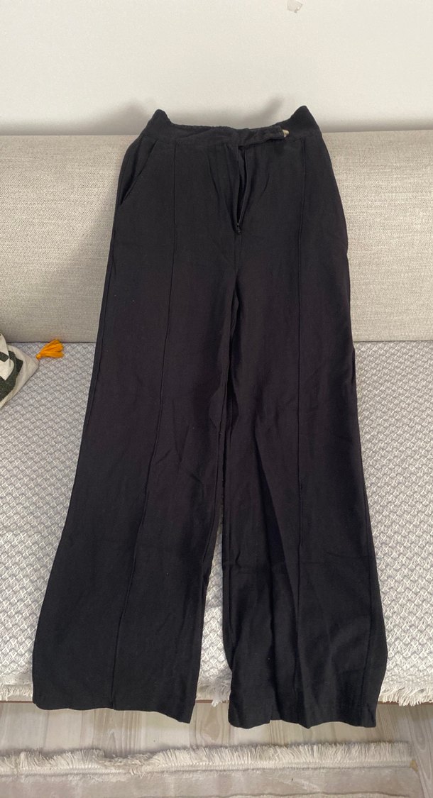 Siyah keten regular fit kadın pantolon. Minimalist tarzda, rahat ve şık, günlük kullanıma uygun.