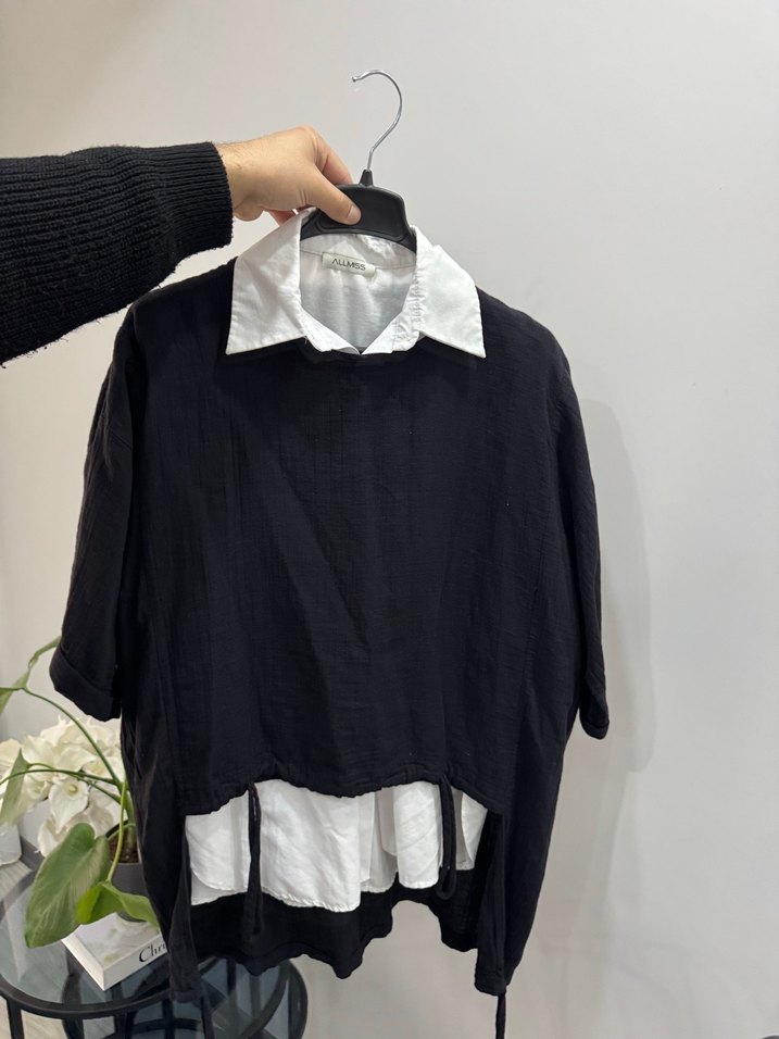 Salaş kesim siyah keten gömlek, yuvarlak yaka ve kısa kollu. Düğme detaylı, siyah-beyaz katmanlı görünüme sahip, günlük kullanıma uygun.
