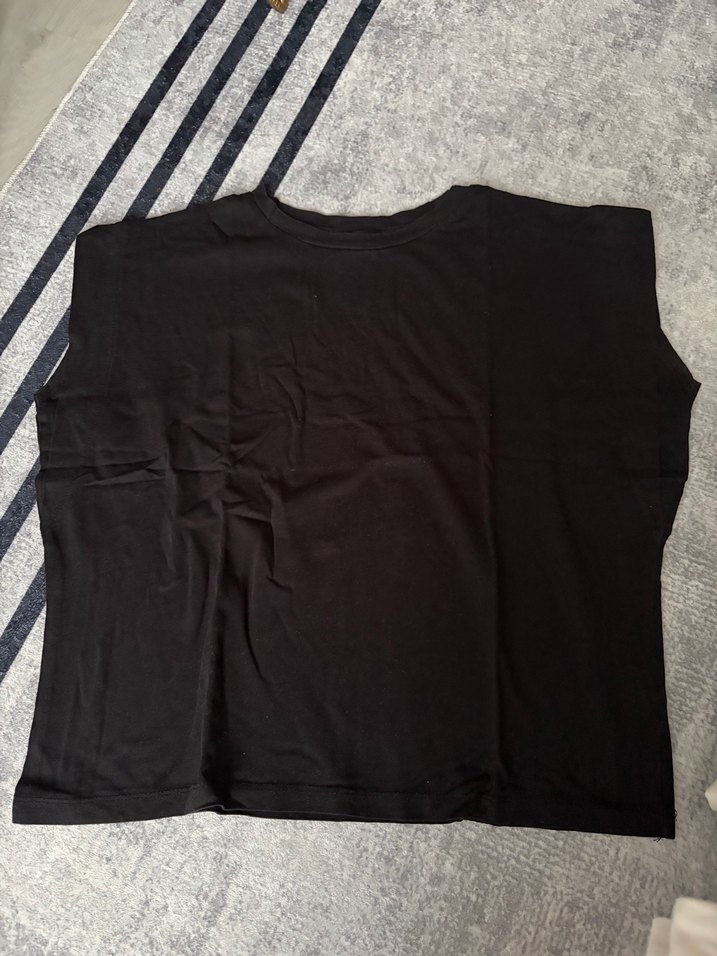 Siyah keten kumaştan, rahat kesim, kısa kollu ve tekne yaka kadın tişörtü, günlük sokak stili için uygundur.