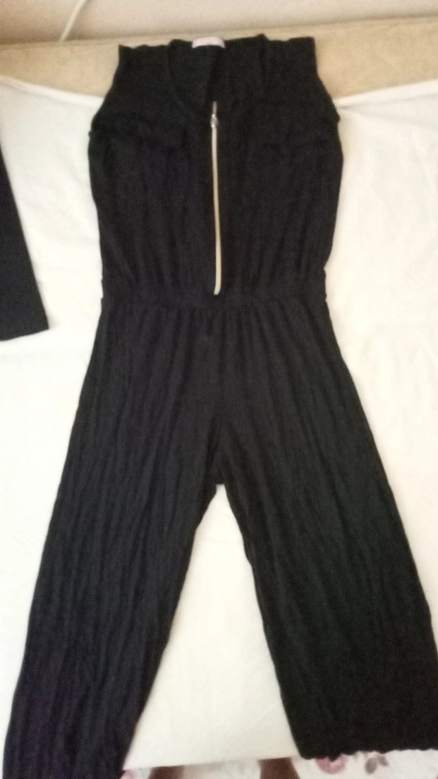 Siyah keten kumaştan, fermuarlı, yüksek yakalı ve kolsuz kadın uzun tulum. Minimalist tarzıyla günlük kullanıma uygundur.