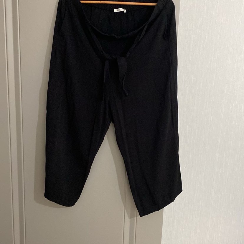 Siyah keten kumaştan, bol kesim ve kuşaklı bel detayına sahip midi uzunlukta kadın pantolon. Minimalist ve normcore tarzıyla günlük kullanıma uygun.