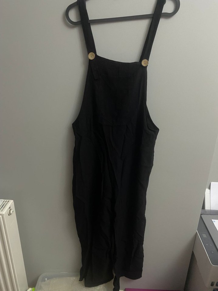 Siyah keten midi uzunlukta, düğmeli askılı ve yüksek yakalı bol kesim tulum, günlük rahat kullanım için uygundur.