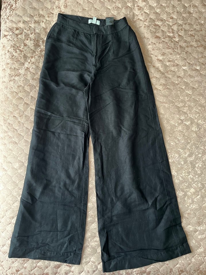 Siyah keten midi boy, bol kesim pantolon. Minimalist ve zahmetsiz şıklık sunar, günlük rahat tarz için uygundur.