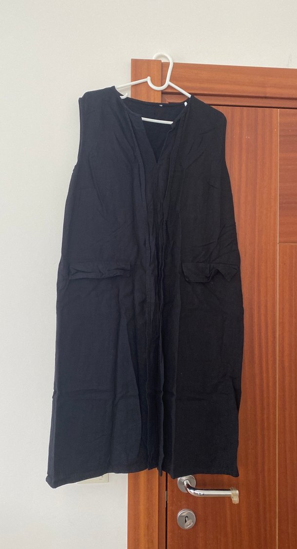 Siyah keten kumaştan, kolsuz, bol kesim ve drapeli tasarıma sahip, V yakalı elbise. Minimalist ve desensiz, günlük kullanım için uygun. Rengi canlı, fotoğraflarda ışıktan belli olmuyor
