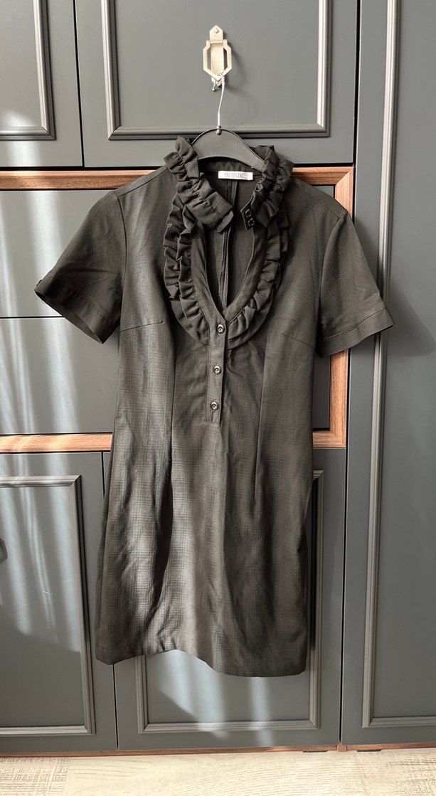 Siyah keten midi elbise, fırfırlı yakası ve kısa kollu. Baskılı dokusu, dar kesimi ve gotik tarzıyla ofis için uygun. Kolları ve yakası düğme detaylı
