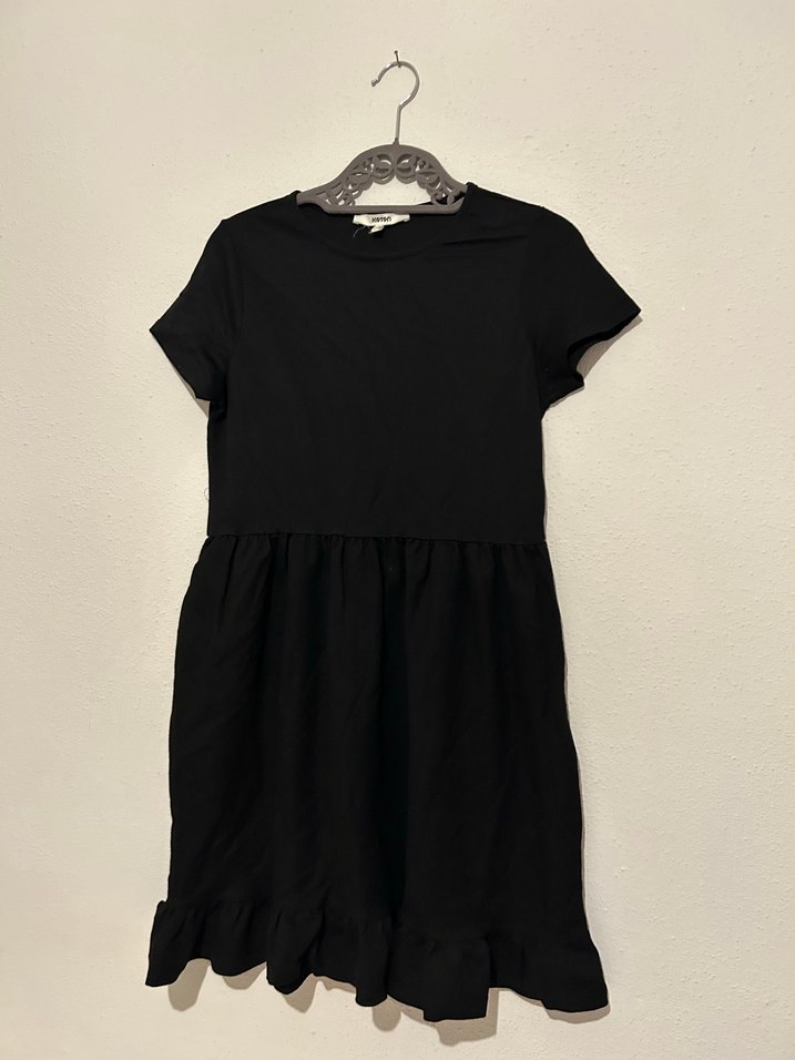 Siyah keten midi elbise, kısa kollu ve salaş kesimdir. Minimalist goth tarzıyla günlük kullanıma uygun, zahmetsiz şıklık sunar.