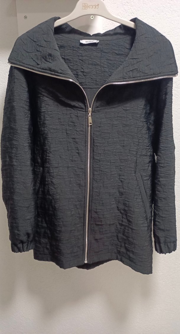 HİÇ giyilmedi 42-44 beden ceket Bu siyah keten ceket, yüksek yakalı ve fermuarlı ön yapıya sahiptir. Uzun kollu ve bol kesim olan ceket, midi boyda ve sokak stili için uygundur. Günlük kullanım için idealdir.