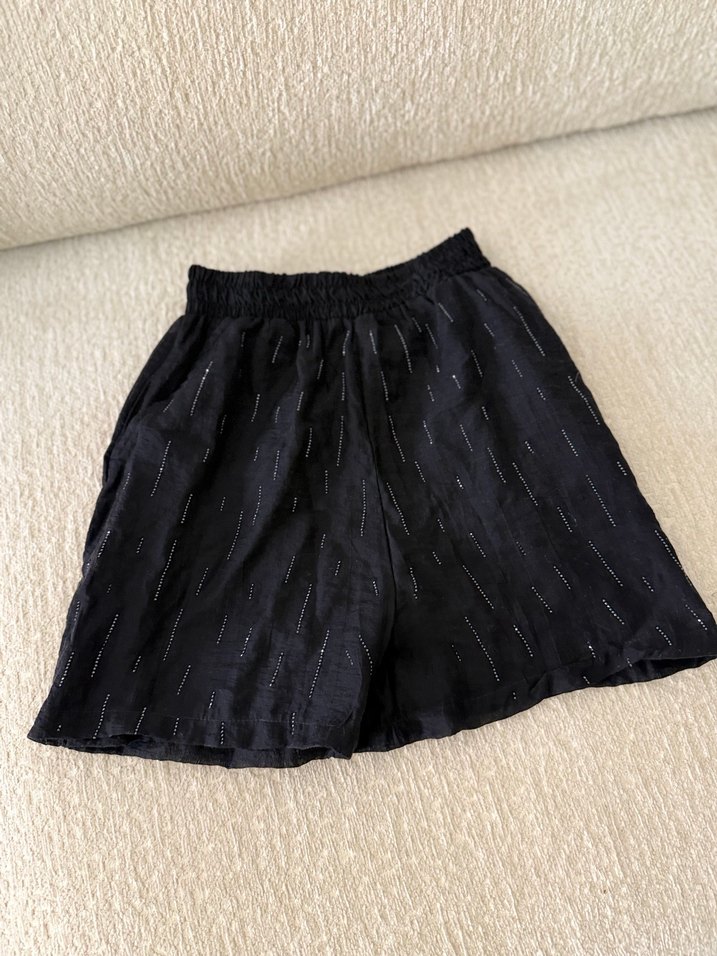 Siyah keten mini şort, bol kesim ve hafif dokulu, romantik akşamlar için minimalist sokak stiline uygun.