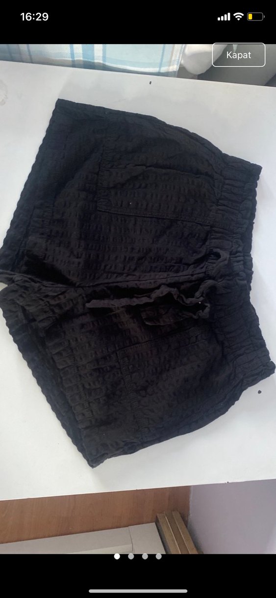 Siyah keten kumaştan, pile detaylı, bol kesim mini sort, günlük kullanım için uygundur.
