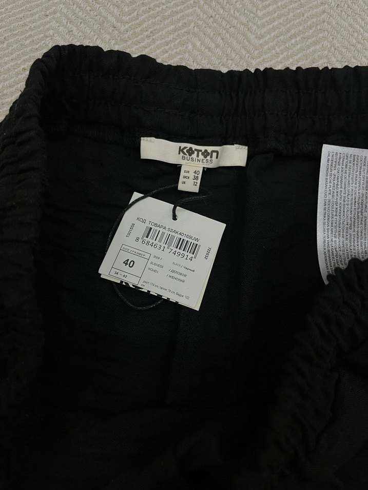 Düğmeli, baskılı siyah keten pantolon, rahat bol kesim ve normal midi boyda, romantik akşamlar için uygun. Normcore tarzda, beden 40.