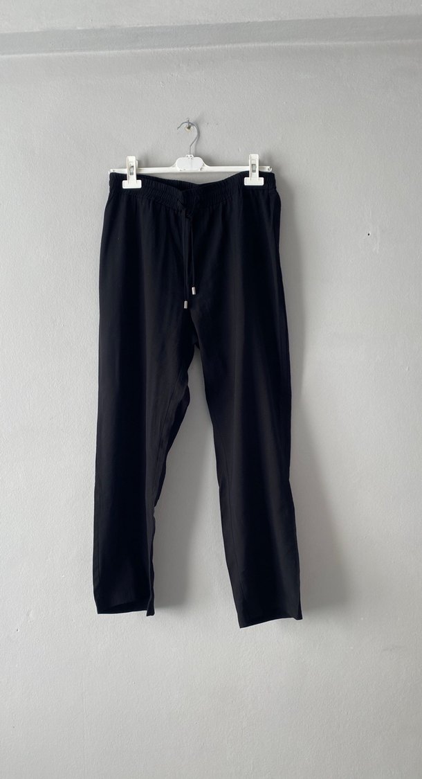 Siyah keten kumaştan, salaş kesim ve midi boyda, rahat ve şık günlük kullanım için ideal pantolon.