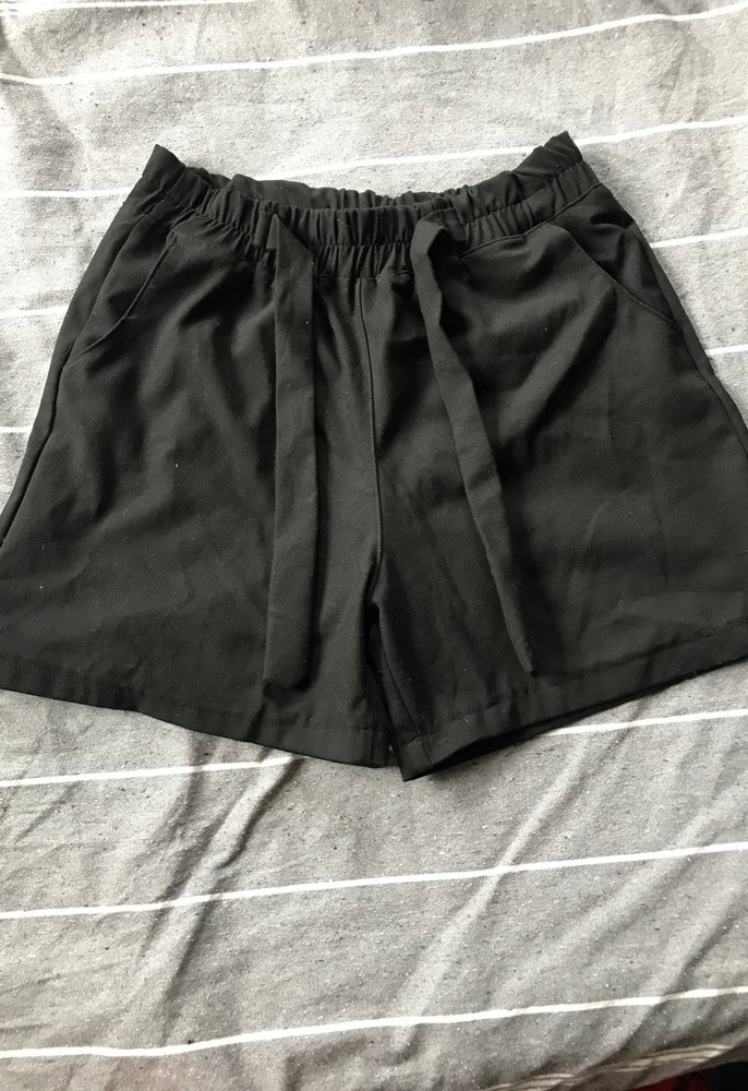 Esnek bel bantlı, bağcıklı siyah keten hamile şortu, salaş kesimiyle günlük kullanıma uygundur.