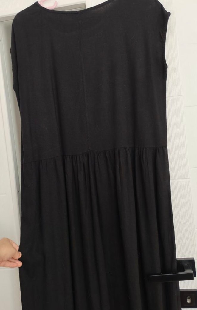 Kolsuz siyah keten elbise, salaş kesimli, drapeli detaylarla minimalist ve avangard tarz sunar. 38 ve 40 bedene çok rahat olur. 36 bedene çok bol gelir. İki kol arası:52 cm boyu:125 cm dir.