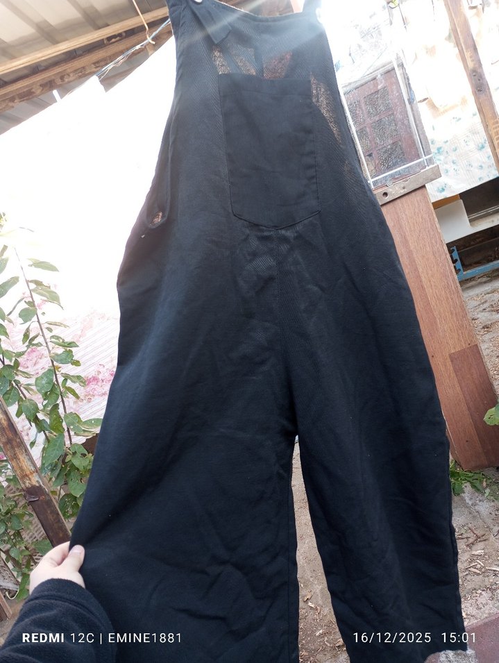 Salaş kesim, askısız yaka ve dökümlü tasarıma sahip siyah keten uzun tulum, avangart sokak stili için uygun.