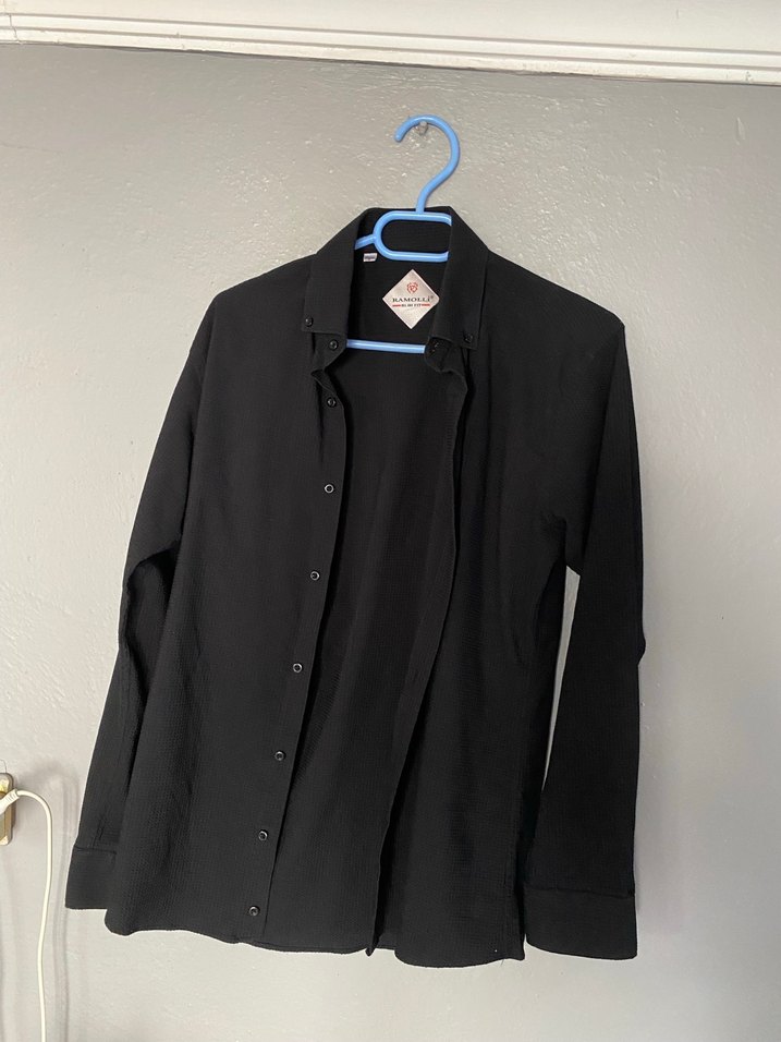 Siyah keten kumaştan, yakalı ve düğmeli önü olan uzun kollu gömlek. Regular fit ve midi boy, minimalist sokak stili için uygun. Günlük kullanıma uygun.