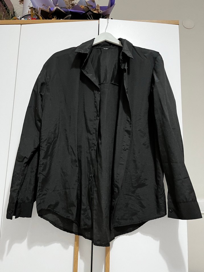 Siyah keten gömlek, çıtçıtlı, notched lapel yakalı ve uzun kolludur. Normal midi uzunlukta, bol kesim ve desensizdir. Ofis için minimalist ve avant-garde tarzda.