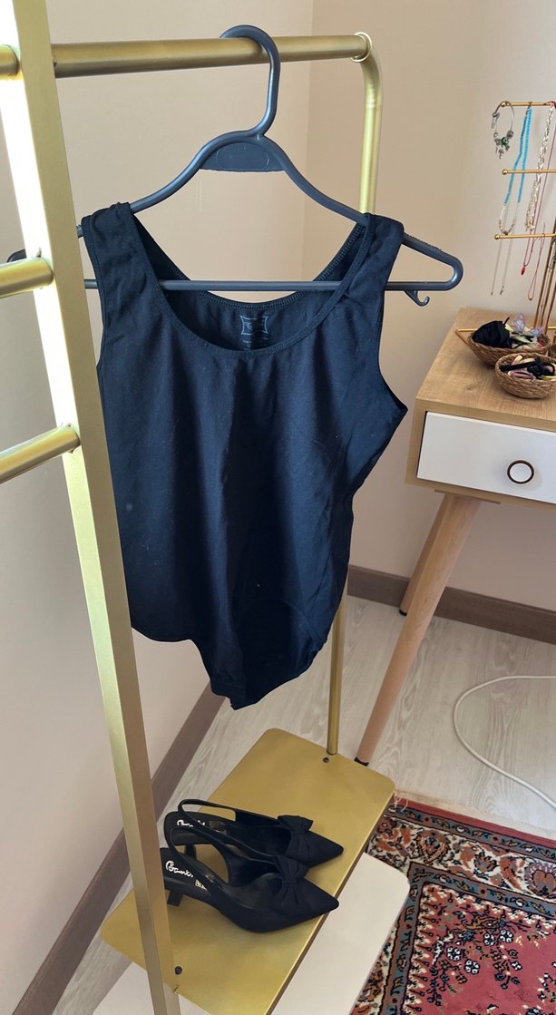 Siyah Keten V Yaka Kadın Atlet body