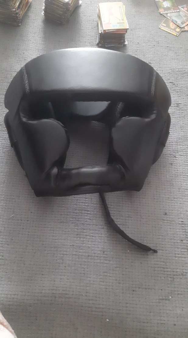 Kemer tokalı, siyah deri biker kask, minimal ve desensiz tasarıma sahip, rock punk havasında. kickbox ya da boks kaskı
