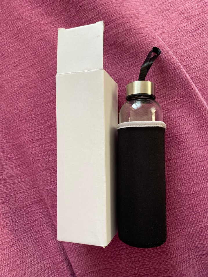 Gümüş kapaklı, siyah kılıflı cam su şişesi ve beyaz kutu. Kılıf taşıma için askılığa sahip.