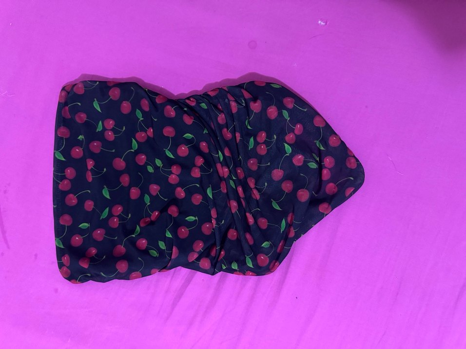Siyah zemin üzerine kiraz desenli, yumuşak sentetik kumaştan yapılmış, bohem ve retro tarzı yansıtan kadın straplez crop
