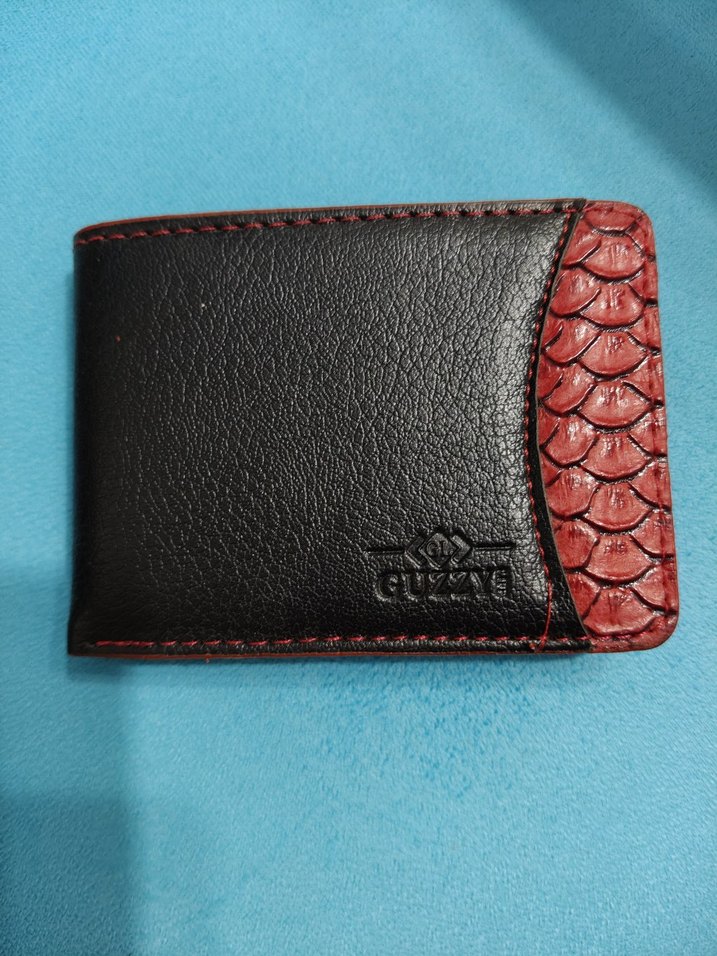 siyah renkte, kırmızı desenli ve kırmızı dikiş detaylı klasik erkek cüzdanı. Vintage tarzı yansıtır.