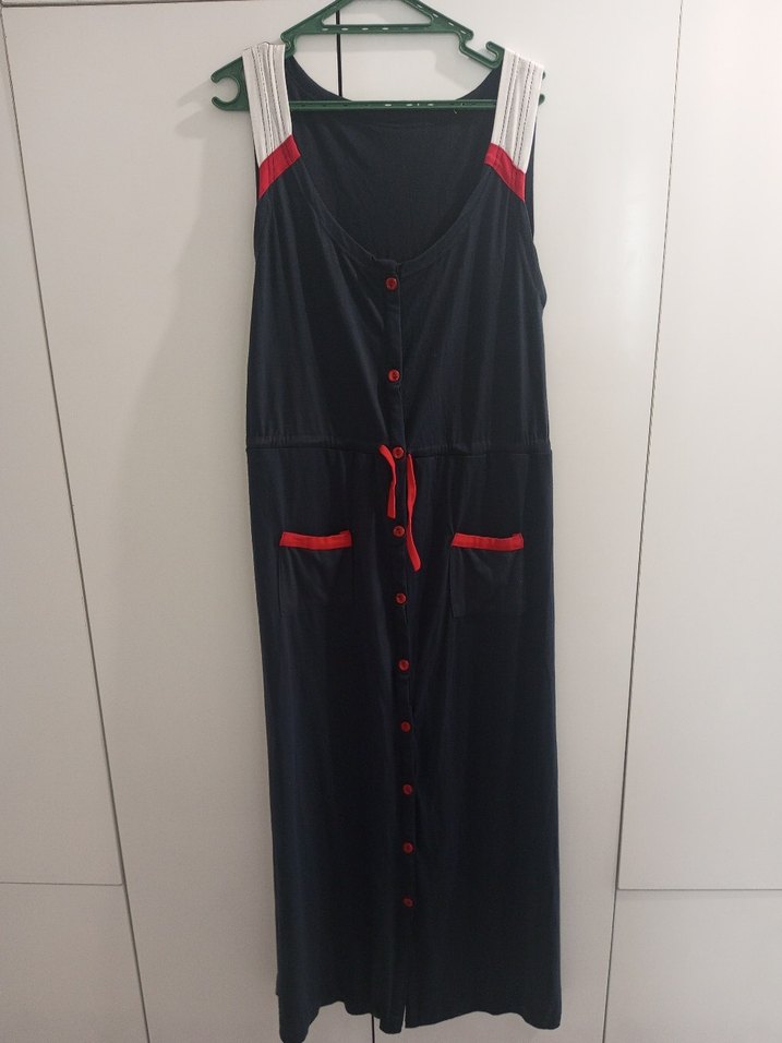 Uzun, kolsuz ve straplez yaka hamile elbisesi. Siyah renkte, kırmızı düğmeler, cepler ve bağcık detayları bulunur. Rahat kullanım sağlar.