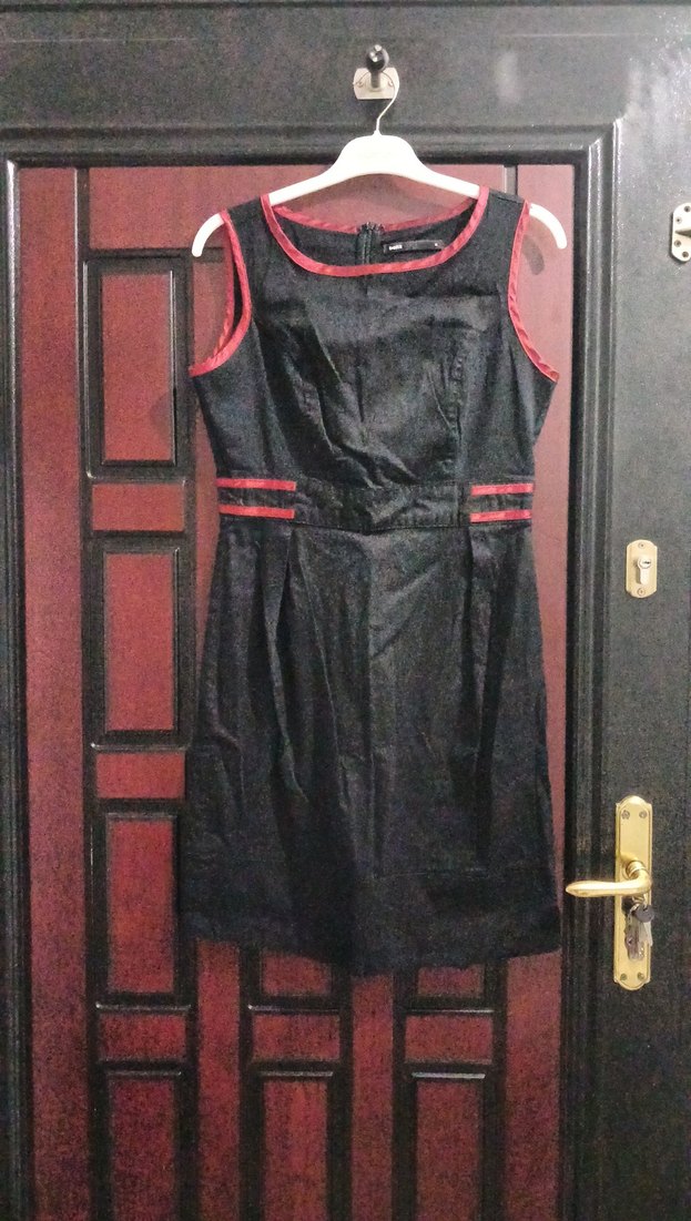 Kırmızı detaylı kenarları ve kemerli bel kısmı olan siyah, kolsuz midi elbise. Normal kesim ve straplez yaka ile ofis için şık bir tercih.