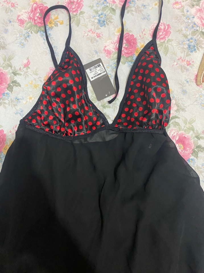 Siyah Kırmızı Puantiyeli İnce Askılı Gecelik