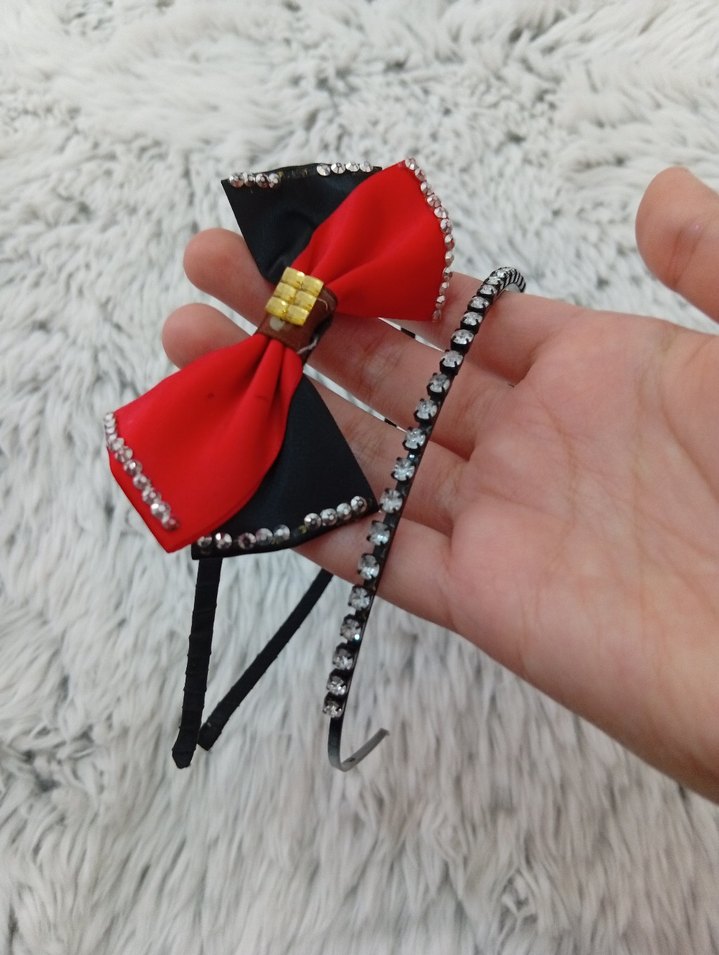 Siyah ve kırmızı renklerde, taş detaylı fiyonk saç aksesuarı. Sentetik kumaştan yapılmıştır, rock punk tarzına uygundur.