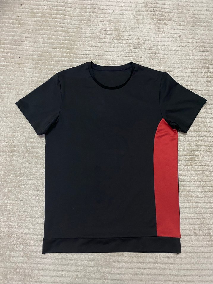 Düz siyah tişört, kırmızı yan panel detayıyla. Kısa kollu, yuvarlak yaka ve rahat kesim. Sentetik yumuşak kumaştan üretilmiştir. İki omuz arası 42 cm iki koltuk altı arası 50 cm boydan 70 cm uzunluğunda tertemiz bir kusuru yoktur