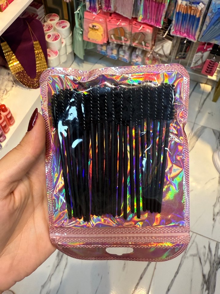 Koyu renk saplı siyah kirpik fırçalarından oluşan set, parlak çok renkli bir kılıfta paketlenmiştir. 25 adet vardır.
