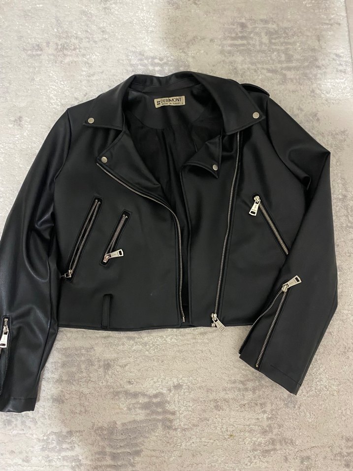 Siyah, dar kesim kısa biker deri ceket, yaka detaylı ve fermuarlı, gündelik kullanıma uygun şık bir parça. Kemeri var m bedene de uyum sağlar