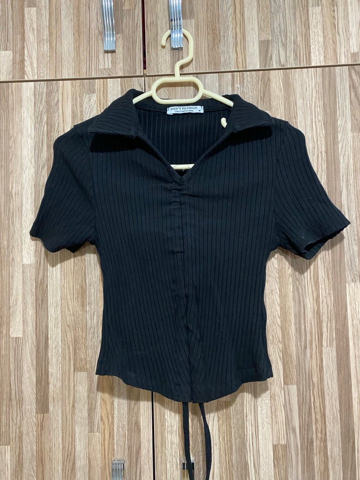 yakalı ve kısa kollu siyah bluz, vücuda oturan kesimiyle günlük rahat kullanıma uygundur. Orta uzunluktadır ve sentetik dokusu vardır.