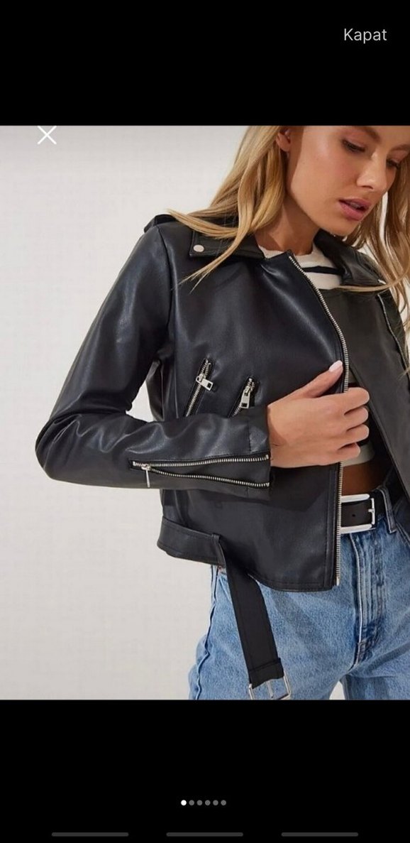 Fıt kesim siyah deri biker ceket, yakasında kesik detay, fermuarlı kol ve tokalı kayış özellikleriyle günlük sokak stiline uygun.