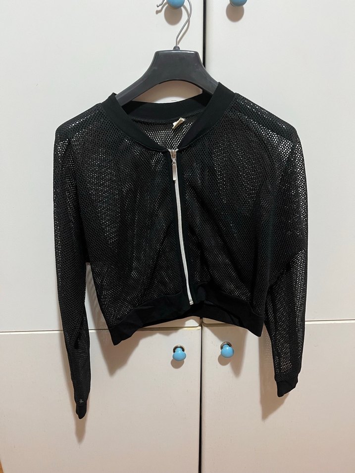 Siyah, vücuda oturan kadın ceketi uzun kollu ve yuvarlak yakalıdır., kısa boylu ve fermuarlı ön kısmı ile günlük spor tarzına uygundur. ( S-M beden uyumludur )