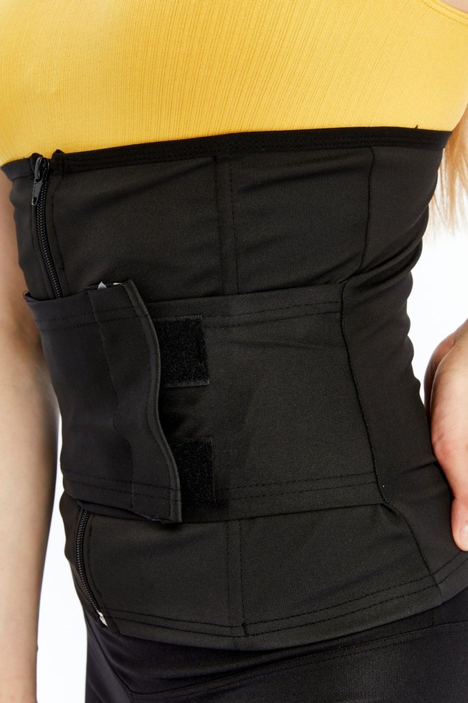 Siyah renkte, kısa boy ve vücuda oturan kesimiyle hemşire korsesi, fermuar ve cırt cırtlı kapama ile destek sağlar.